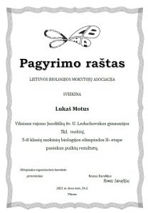 Kovo 24 d. vyko nuotolinis 5-8 klasių mokinių biologijos olimpiados II etapas, kuriame dalyvavo mūsų gimnazijos mokiniai. Penktokas Lukasz Motus už pasiektus puikius rezultatus buvo apdovanotas pagyrimo raštu.