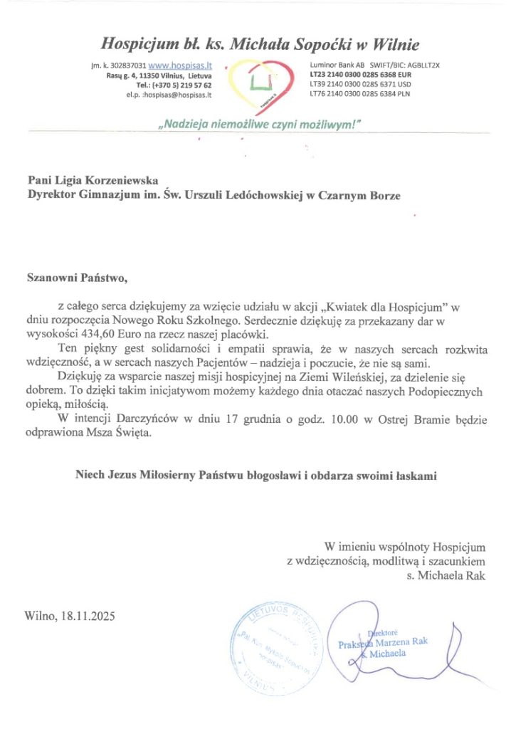 Kartu pridedame palaimintojo kun. Mykolo Sopočkos hospiso padėką – jie nuoširdžiai vertina kiekvieną paramos gestą.