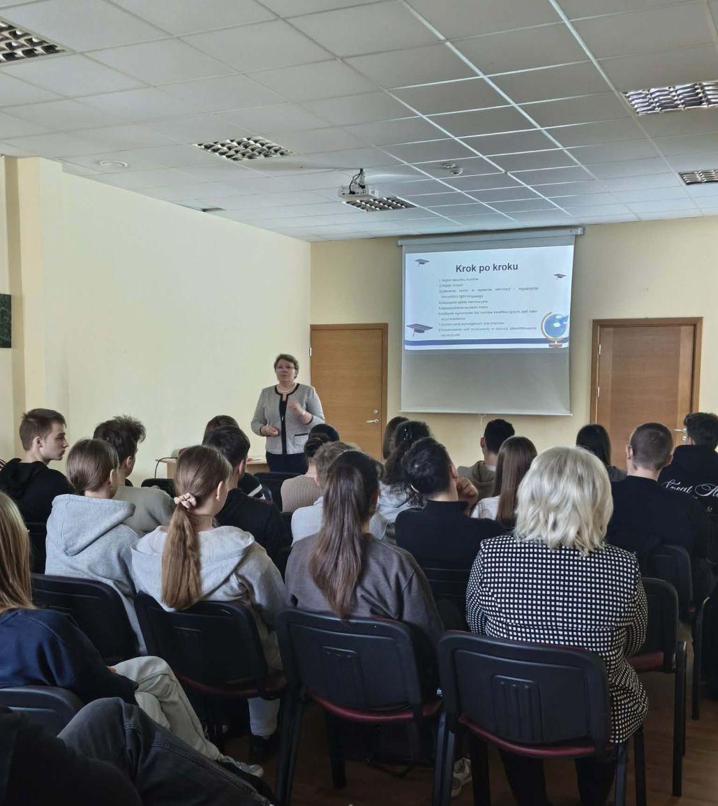 Susitikimo metu Vilniaus r. Švietimo Skyriaus vyriausioji specialistė Renata Cytacka žingsnis po žingsnio paaiškino, kaip vyksta priėmimo į aukštąsias mokyklas procesas. Ji papasakojo apie reikalingus dokumentus, terminus bei tai, į ką verta atkreipti ypatingą dėmesį, kad stojimo į studijas etapas praeitų ramiai ir be streso.