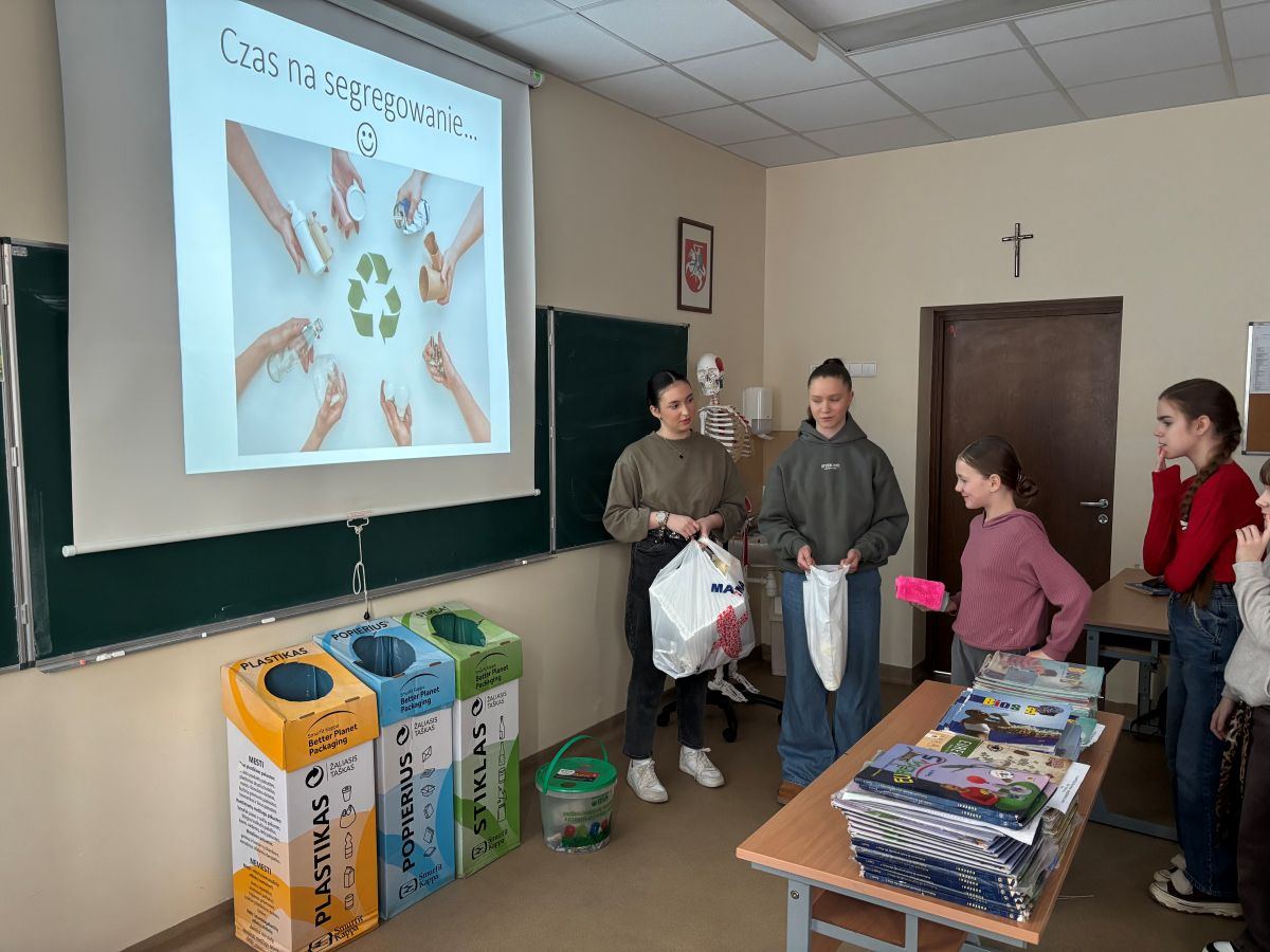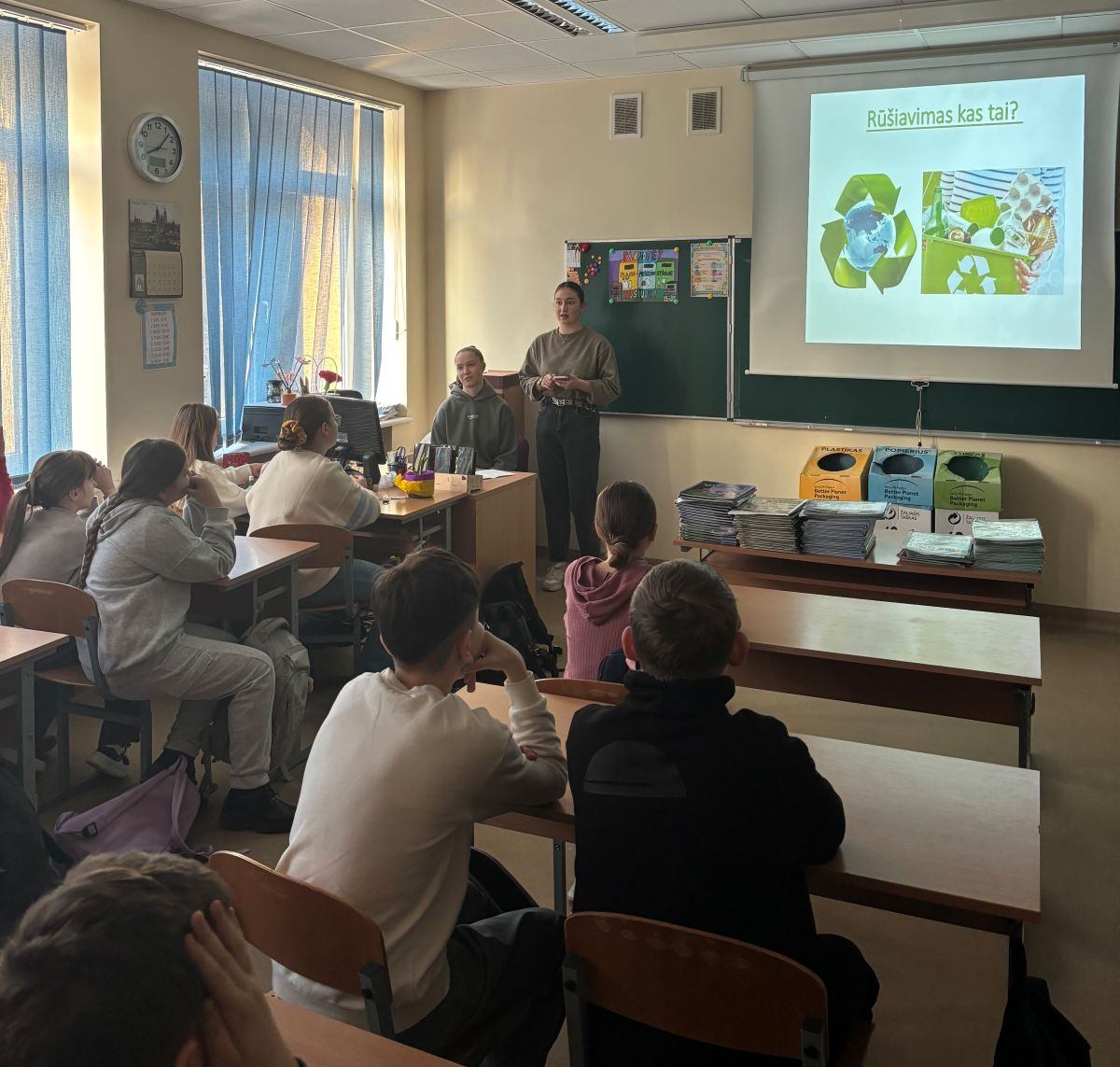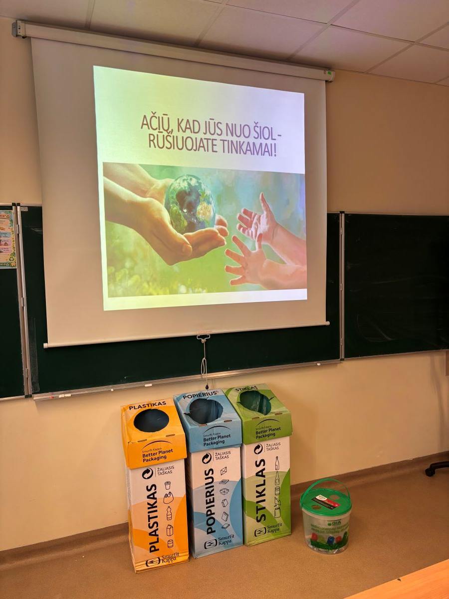 Kovo 13 dieną 5-6 klasių mokiniai dalyvavo edukacinėje pamokoje apie atsakingą atliekų rūšiavimą. Pamoką vedė vyresnių klasių mokiniai, „Žalioji odisėja” projekto dalyviai. Pamokos metu mokiniai pagilino ir pasitikrino savo žinias apie atliekų rūšiavimą, aktyviai atsakinėjo į klausimus ir patys juos uždavinėjo. Pamokos metu buvo pabrėžta, kaip svarbu teisingai rūšiuoti atliekas, nes tai padeda saugoti aplinką ir leidžia pakartotinai panaudoti žaliavas.