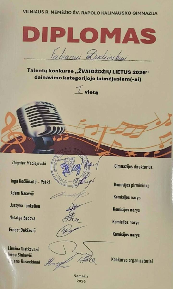 Vilniaus rajono švietimo įstaigų pradinių klasių mokinių talentų konkurso „Žvaigždžių lietus“ II etape mūsų 4 klasės mokinys Fabian Dudzinski iškovojo 1-ąją vietą!
