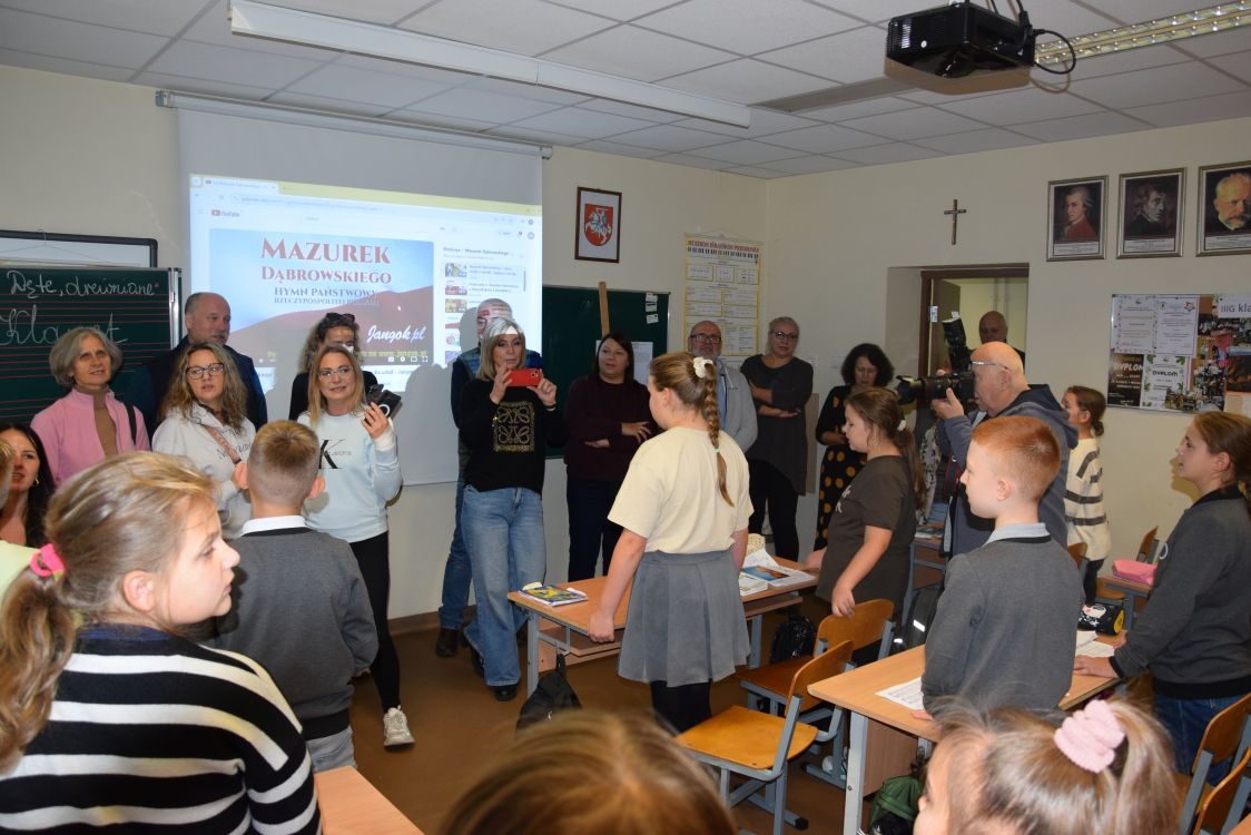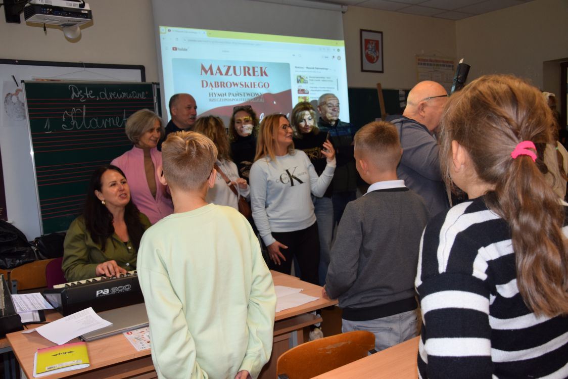 Nasi goście odwiedzili również lekcję muzyki w klasie czwartej. Uczniowie z entuzjazmem zaprezentowali „Walc wileński”, a następnie wspólnie z gośćmi zaśpiewali piosenkę „Jak długo w sercach naszych”.