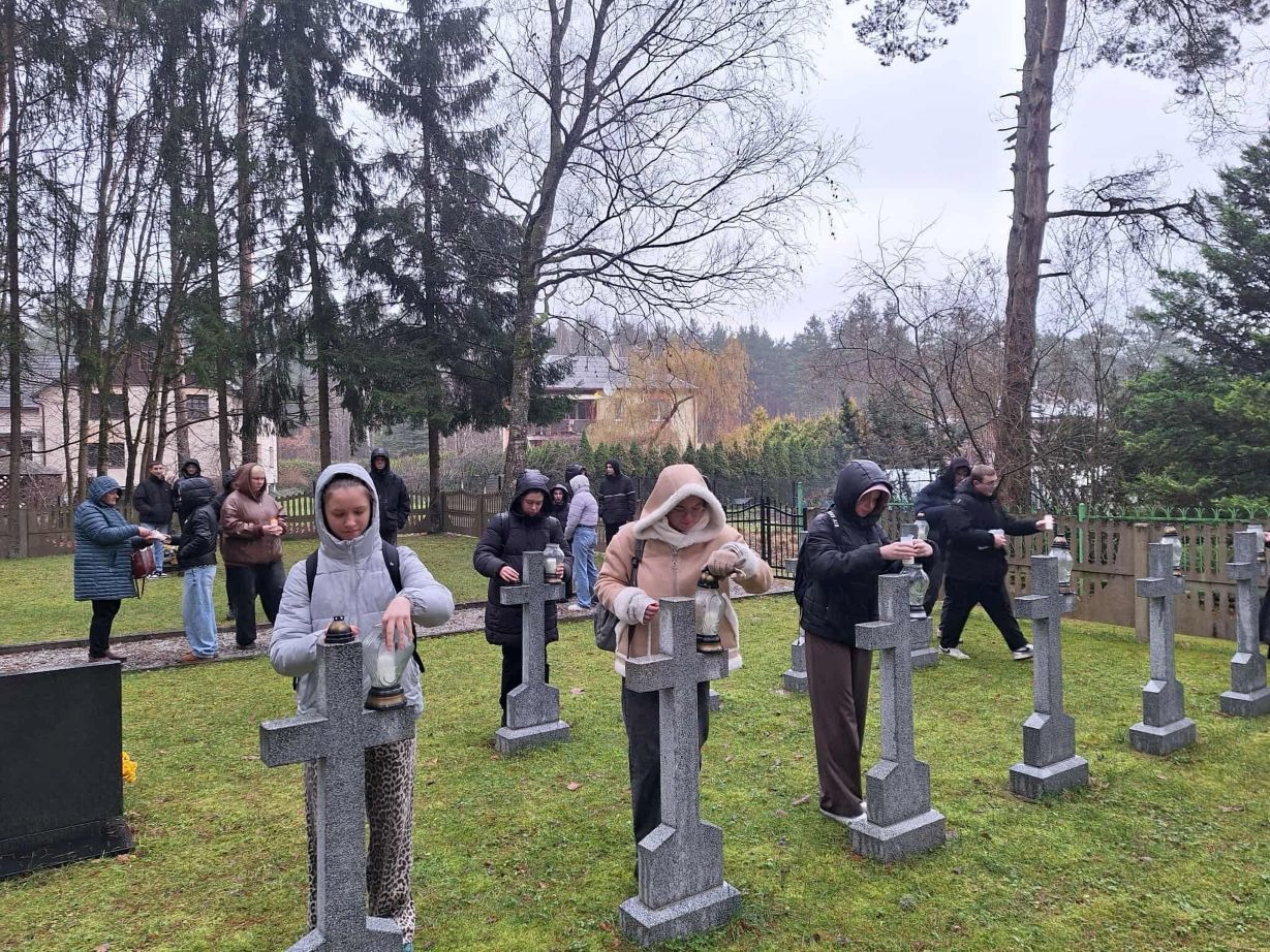 Ostatnim punktem tej wyprawy był Czarny Bór. Zwiedziliśmy dom „Opatrzność”, w którym ukrywał się bł. ks. Michał Sopoćko. Wydawało się, że ściany tego miejsca wciąż przechowują echo jego modlitw, obaw i nadziei. Odwiedziliśmy także dom Józefa Mackiewicza – pisarza, którego duch zdawał się unosić w świetle wpadającym przez okna i w ciszy niewypowiedzianych słów. Na zakończenie zatrzymaliśmy się na niewielkim cmentarzyku sióstr urszulanek. Wśród szumu drzew zapaliliśmy znicze – małe światła pamięci drżące na wietrze niczym delikatny znak wdzięczności.