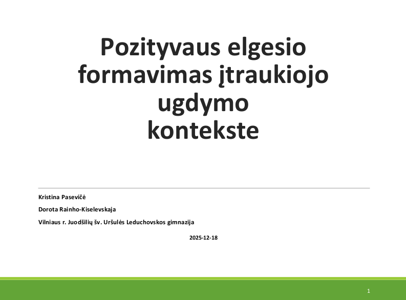 Podczas spotkania zaprezentowano rekomendacje mające na celu podniesienie jakości edukacji włączającej w szkołach, omówiono modele współpracy oraz przykład dobrych praktyk w organizacji edukacji włączającej. Psycholog gimnazjum K. Pasevičė przedstawiła prezentację, przygotowaną we współpracy z pedagogiem socjalnym Dorotą Rainho-Kisielewską, pt. „Kształtowanie pozytywnego zachowania w kontekście edukacji włączającej”. W wystąpieniu zostały przedstawione sposoby, formy i pomoce dydaktyczne sprzyjające wspieraniu pozytywnych zachowań uczniów ze specjalnymi potrzebami edukacyjnymi, podkreślono rolę specjalistów pomocy ucznia oraz zaprezentowano przykłady dobrych praktyk naszej placówki.