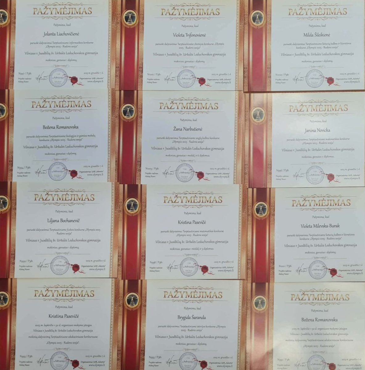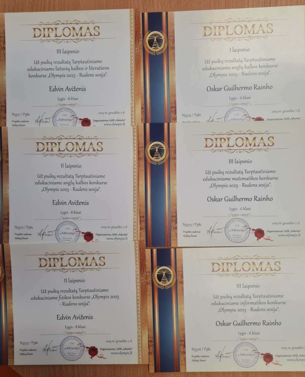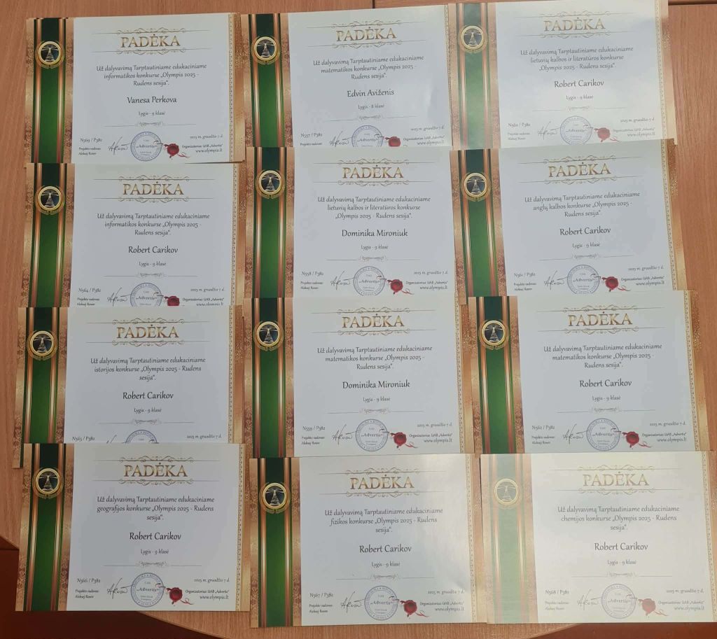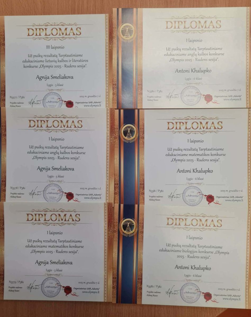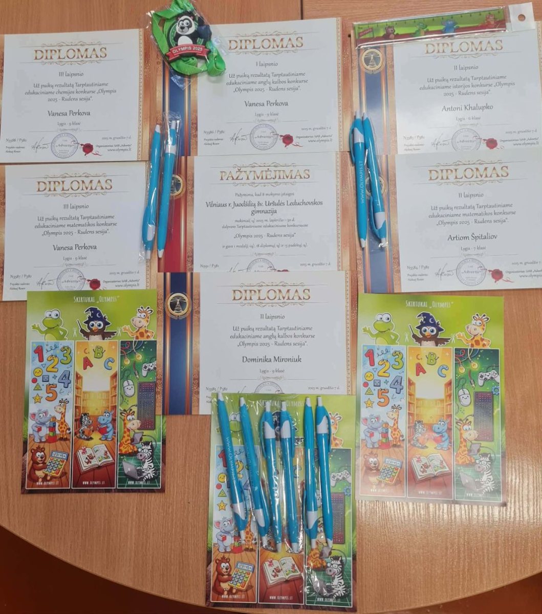 Jesienią uczniowie naszego gimnazjum wzięli udział w tradycyjnym Międzynarodowym Konkursie Edukacyjnym „Olympis 2025” – sesji jesiennej. Osiągnęli bardzo dobre i dobre wyniki z języka litewskiego, biologii, matematyki, języka angielskiego, informatyki, fizyki, historii oraz chemii, zajęli miejsca na podium i zostali nagrodzeni dyplomami, długopisami oraz medalami.